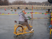 so i've pretty much finished exploring beijing, although we didn't get a chance to see some of the sights (i.e. White Dagoba, Temple of Heaven, eating another round of Peking Duck) because we ran out of time or we had seen enough temples or it was just too cold to warrant further exploration as we sipped our delicious hot tea. one bonus due to the freezing weather is that the rivers and lakes are all frozen over...so much so that you can definitely shortcut across the frozen lake (like at the Summer Palace) from the Buddhist Fragrance Pavilion to the 17-Arch Bridge (yep, all the chinese residents disregard the "stay off the ice" signs so we joined in as well like a good pair of lemmings). at Beihai Park, you could even pay an exorbitant amount (100 rmb or about $12.50) to ride across the lake on a bicycle with sleigh runners! the Great Wall was quite a sight, but the scenery was not as delightful as it would have been in the spring, summer, or fall. incidentally, the driver we hired was great and if you will be in beijing, check out www.beijing-driver.com.
